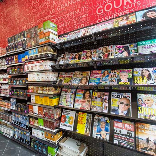 The sale at retail of a wide variety of hot and cold beverages, by way of example; juices (fresh and bottled), pop, water, milk and smoothies, coffee and tea, regular, organic and gluten free snacks (bulk and single serve), by way of example nuts, pretzels, chips, cakes and pastries, protein bars and powders and vitamin supplements, confection including chocolate bars, ice cream, gums, candy, mints and rolls, pre-packaged sandwiches, salads, dips and pasta salads, fresh fruit (single serve), eggs and bread, transit tickets, souvenirs, lottery tickets, health and beauty products, greeting cards, telephone cards, postal supplies, office supplies, flowers, mobile devices and accessories and the services of; Western Union, ATM, postal outlet, dry cleaning depot, and as ancillary, the sale at retail of tobacco and non tobacco related products i.e. electronic cigarettes, newspapers, magazines and novels.